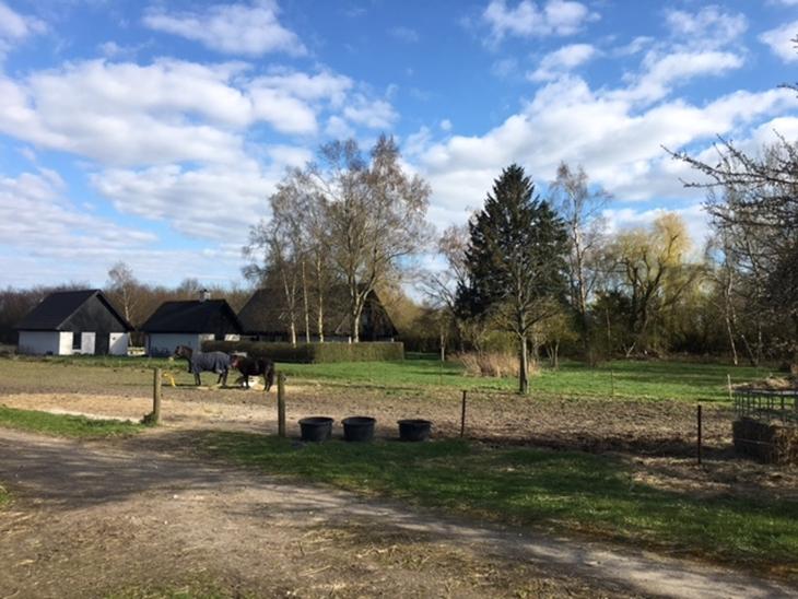 Der er egne baner og ridehus hos naboen, samt ca. 30 min til Vestskoven og øvrige turmuligheder i nærområdet på mark og stier.