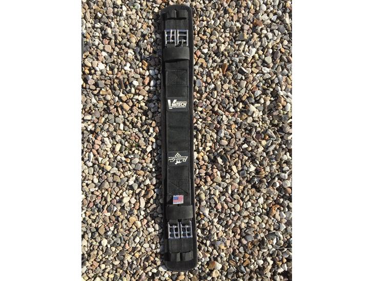 Pæn og velholdt dressurgjord i str. 65cm. brugt under et halvt år. Bagsiden er lavet af sved og skridsikkert materiale, og den kan tages af og er derfor nemt at vaske.