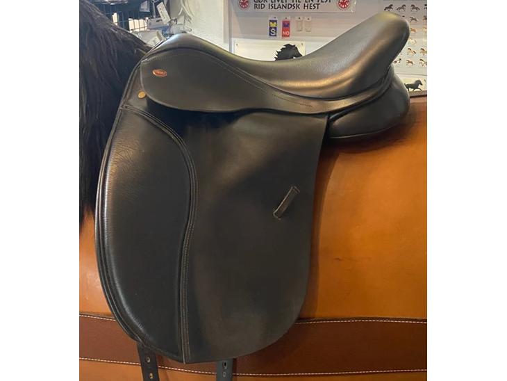 Engelsk produceret sort sadel med bredt kammer og uldpaneler.