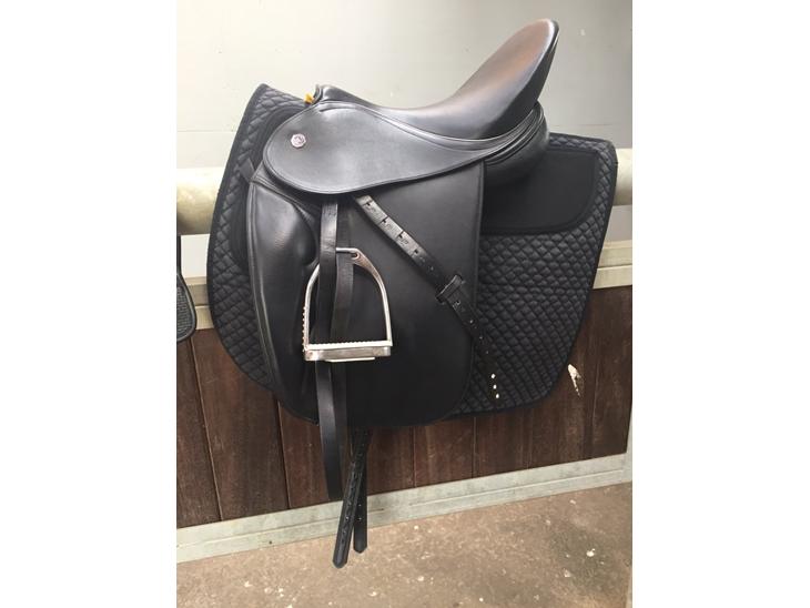 Butterfly Mary 17", Lækker dressur sadel der former sig efter hesten sælges. Kan passe på mange heste da den er fleksibel i bommen og tilpasser sig automatisk hestens brede. Giver en utrolig arbejdsfrihed til hesten og en dejlig støtte til rytteren. Knæstøtterne kan skiftes til mindre da de største sidder i nu :)