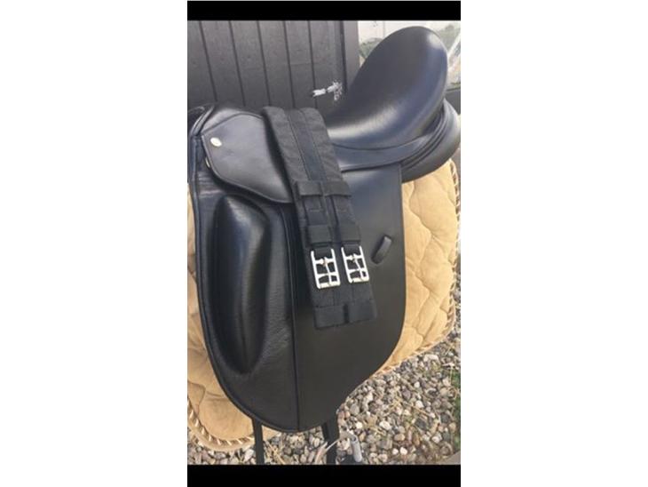 Fantastisk lækker dressursadel str 17,5. Bred bom. Blødt sæde og store knæstøtter(bløde) kvalitetslæder og giver mange muligheder for at tilpasse mange forskellige typer heste ny pris er 21900kr