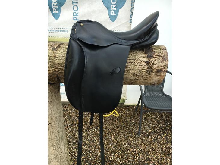 Sjælden udbudt lækker dressursadel med dybt sæde og stor udvendig knæstøtte. 17" og bred bom. I pæn stand, god stopning og ok gjordstropper - alm. Brugsspor.