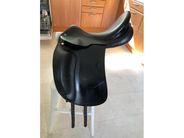 Toplækker Prestige Roma dressage sadel sælges. Den er en 17" og med bom 33 (mellembred). Lækkert kalvelæder og med gele i både knæstøtter og sæde.
