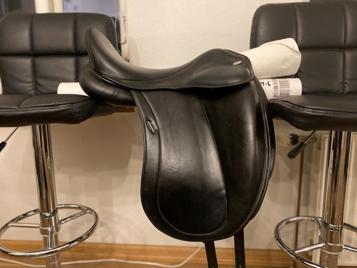 Super lækker monoflap dressur sadel med stor knæ støtte og dybt sæde, giver optimal støtte uden at låse rytteren fast.