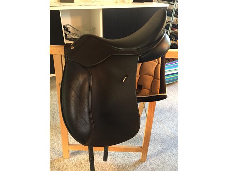 Wintec Wide 500 dressur New, 18" og en anlægsflade på 44-44,5 cm. Lidt svært at måle.
