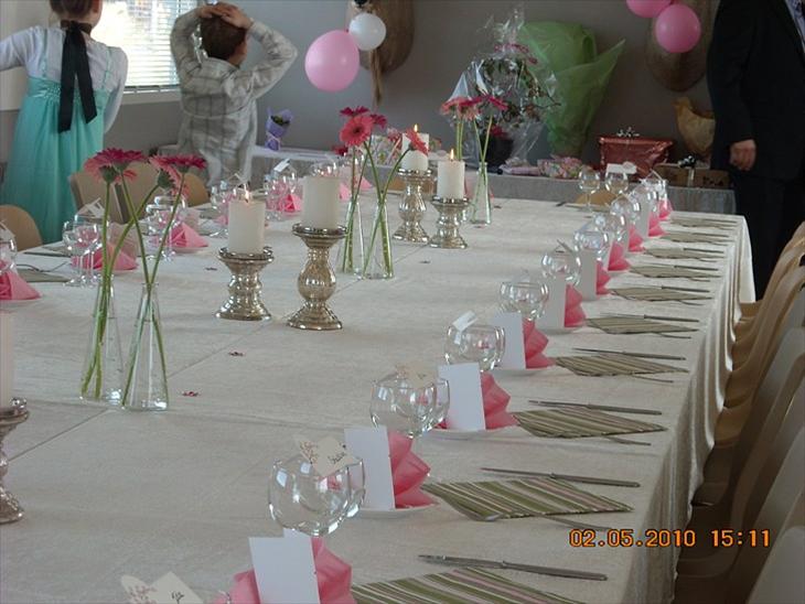 Hvordan var bordet/borderne dækket op? - De var dækket med hvid dug, pink sommerfugle som skilte og pink lys med noget blad halløj på.