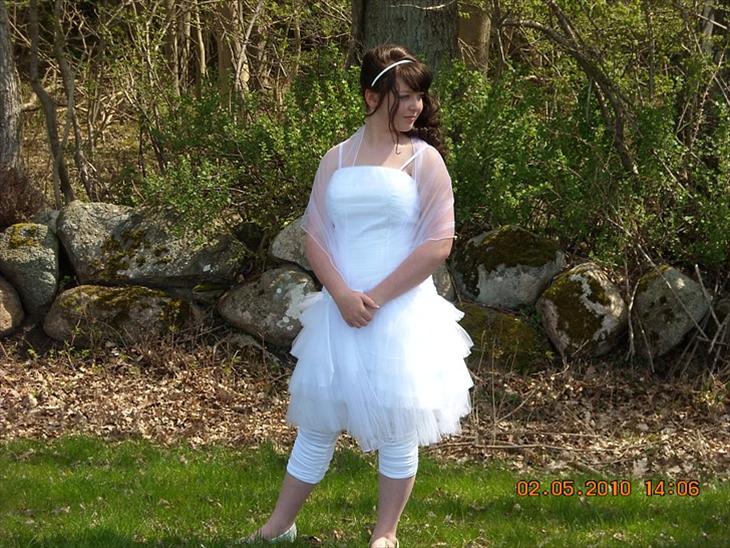 Vi fik 3 retter, forskelligt fisk til forret, kød og mange salater til hovedret og 3 kager & kaffe+the til dessert. Så var der selvfølgelig chips+snacks og velkomstdrink/champagne til alle til start. Billede af min kjole: (intet af mit tøj er fra "konfirmations" butikker, da jeg slet ikke kan klare sådanne kjoler)