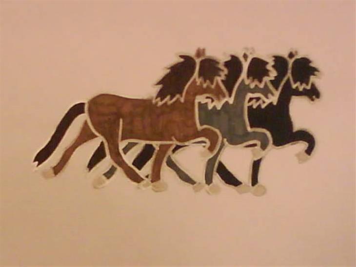 Printede et billede ud af en hest med rytter i töl, og tog så et hvidt papir og tegnede efter! Og så har jeg selv tegnet man, hale og pandelok. Så har jeg med den første jeg tegnede, lagt den under et hvidt stykke papir, og tegnet den en masse gange! :D