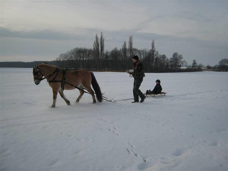 Emil og Søren har hygget sig med at spænde Virago foran slæden. Når man ikke har en kane og vejen er for glat til at køre med hestevogn, ja så må man være kreativ...