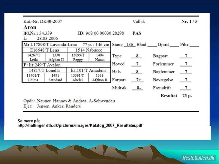 Aron har et rigtig dejlig afstamning. han var bl.a. til føl kåring i 2007 som 1års og var kun 1 point fra at bliver hingste kandidat. Aron blev klassens bedste hingste føl :-)