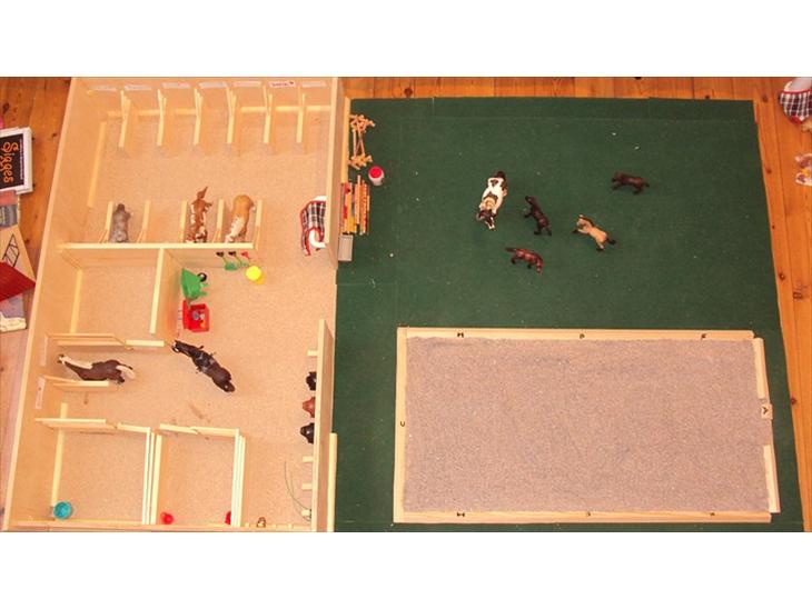 Den er lavet af en stor spånplade (i mål så den passer under min seng) med hjul under, trælister og tynde lister til mur og skillerum. Små søm til knager. Filt med lim bagpå (i rulle) til græs, blomstersand limet på dressurbanen. Alt er sat sammen med trælim, sekundlim eller små søm og skruer.