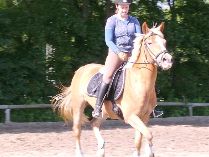 i starten havde hun en stor underhals, og var meget stærk i halsen. hun var næsten umulig at få til at vende rigtigt. hun smed ryggen da hun ikke havde musklerne til at bruge sig rigtigt. vi begyndte at ride hende lang, og få hende til at bruge ryggen, og hun kom til at slappe af i halsen. efterhånden som vi fik sat muskler, kom samlingen helt af sig selv. hun er blevet utrolig let at ride, enormt blød på tøjlen, og reagere super for ben og sæde.