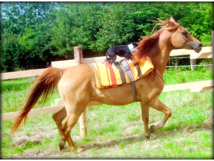 Lidt fotos a min dygtige hund Sukiyaki, der rider i trav og galop og som rider bedrer end mange mennesker ;)Hun har en helt fantastisk balance,skulle hun miste den,springer hun selv af.men det sker kun meget sjældent.Suki elsker at ride,men hun er på flere områder en noget pivet hund,men ikk når det kommer til ridning,så er hun helt unik :)Men det sjove ved det hele er,at hun kun vil ride på Spirit :)))Suki er 7 år gl.og har redet på egne poter siden hun var et år gl.Suki har været med ude og ride siden hun var 8 uger gl hvor hun sad inde i jakken .Når hun rider holder hun fast med for poterne på hver side af Spirits hals,og udover det følger hun hans bevægelser i hele hendes lille krop,hun kan også hænge fast på ham,når han stejler og laver andrer tricks :)
