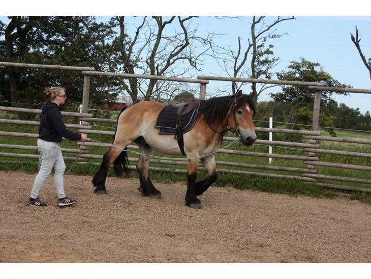 Gustav - dejlig belgier på 5 år i tilridning, trænes for første gang med rytter.