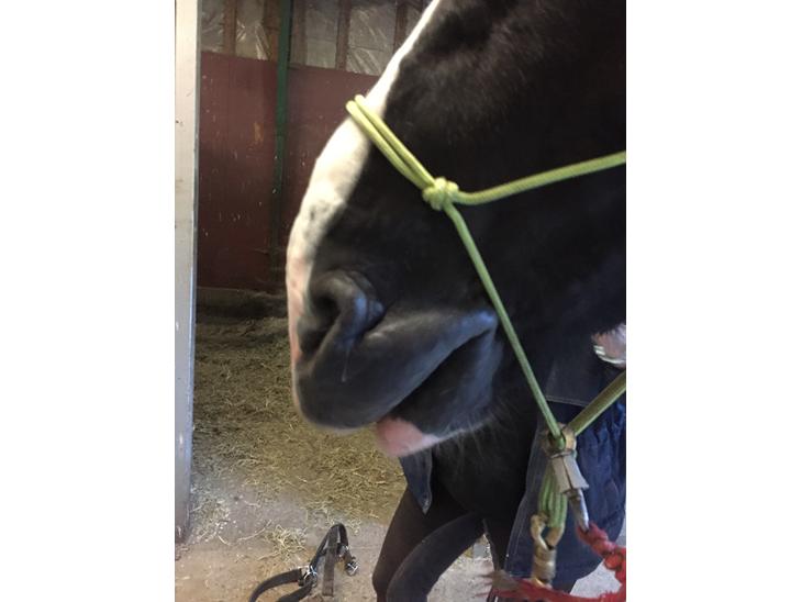 Efter han havde spist sit foder gik vi en tur, han virkede frisk ved maden og på turen, men da vi kom tilbage så skal jeg lige love for at det ændrede sig! Inden for 10-15 minutter hævede han op i hele hovedet, især omkring mulen og så spredte knopperne over HELE kroppen (ja selv haleroden var fuldstændig oversået med knopper). Stakkels hest. Dér blev jeg bekymret, var simpelthen bange for at hans luftveje ville lukke til. Han fik 7 antihistaminer og jeg fik fat i en vagtdyrlæge.