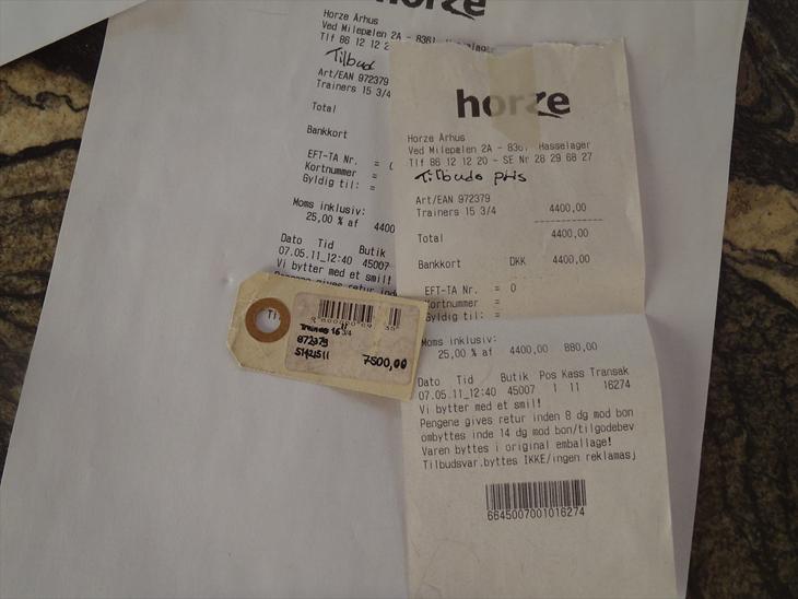 Der er både Kvittering, kopi af kvittering, og den der sad på sadlen, med Tommer og nummer, samt dato