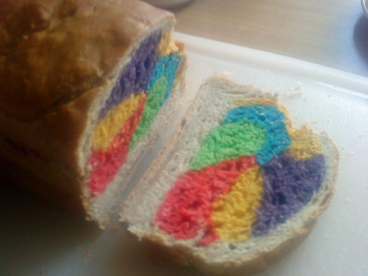 Ja så fik jeg det testet, og fik flere ideer undervejs til en anden god gang. Det smager som ganske normalt franskbrød, er farvet med pastafarver og så er der lagt en ganske neutral dej udenom.