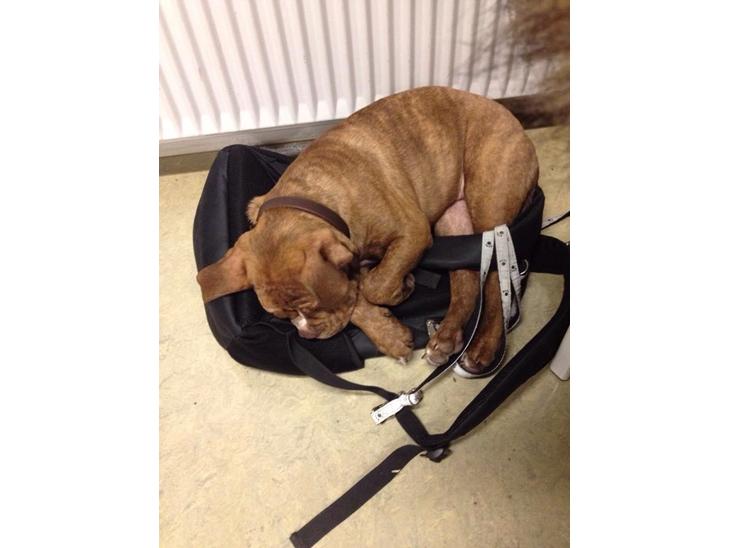 Hun er en old english bulldog på 8 uger, vi har fået hende idag fra Holland, så det har været en lang tur for den bette