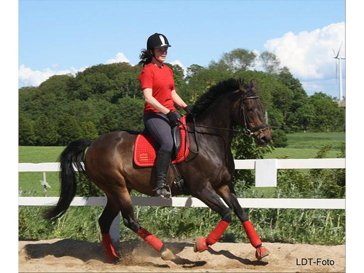 Hun er bare ønskehesten, jeg fik hende da jeg var 12 og det var bare lykken. Jeg havde ønsket mig en hest siden jeg var 6 år. Jeg startede med at ride hendes mor og da jeg så, hende første gang vidste jeg bare at det skulle være hende jeg skulle have. Hun kunne kun skridt, trav og stoppe da jeg fik hende ( hun var 3½). Så det har været nogle sjove, men også hårde år at lære hende det hun kan i dag;D Hun bliver 7 år den 3. Maj. Hun er dejlig, sød og rolig. hun er også utroligt lærenem, lige nu øver vi LB programmer:D Elsker virkelig den hest over alt på jorden<3