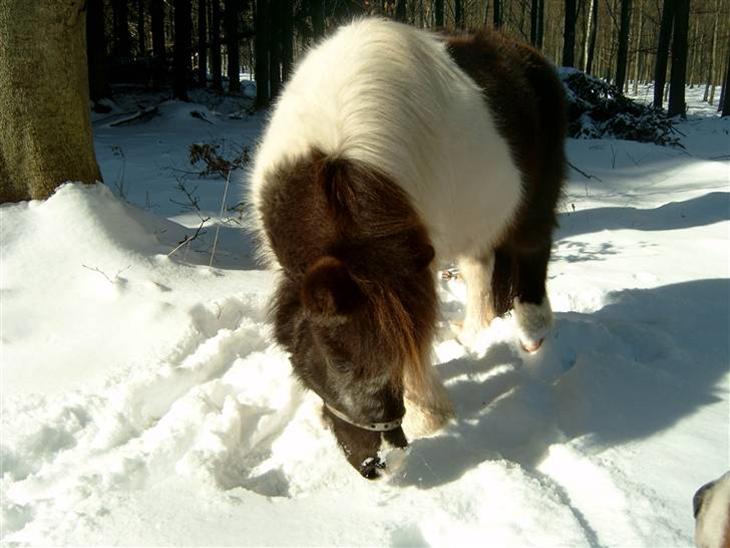 Meget smuk lille sortbroget hoppe med et "glasøje" lidt welsh mountain agtg med araber haleføring, små spidse øre og lille fint hoved, har haft hende i vores hestefamilie siden 1990 hvor jeg købte hende med hjem efter mit ophold på efterskole, hun er omkring 30 år gl nu og har det super, stadig glad og løber gerne rundt og bukker og puster på folden, har trukket lidt ture med børn , men kan ikke lide det, vi har kørt hende meget lidt for vogn da hun var meget utilregnelig, hu har været udsat for ret dårlig behandling inden vi fik hende, hun bed og sparkede, men det har hun ikke gjort siden vi fik hende hjem.