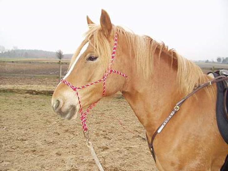 Hun er blanding mellem araber og haflinger, har fået det gode fra begge racer. Araberens lethed og ynde og haflingerens gå-på-mod og stærke bygning.
