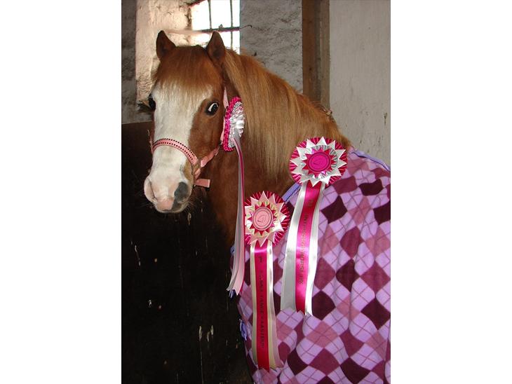 29/1-2012 Surprice er blevet en rigtig lille nusseprinsesse og er ifolet med Dandy. I går ordnede jeg hende lidt og ville tage et fint billede med en flot rosette. Hun var bare så sød, lagde hovedet hen over min skulder mens jeg striglede hende i hovedet og var så sød så sød og stod så fint med rosetten på :-)
