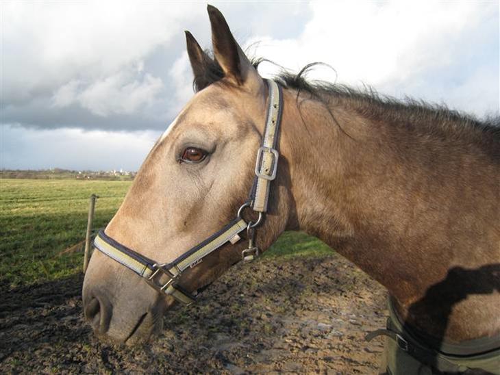 Jeg fik egentlig Dundee lidt ved et tilfælde, det var slet ikke meningen jeg skulle have en trejde hest, men kunne alligevel ikke lade være med at kigge efter en god dressurhest på div. salgssider efter jeg var kommet af med min skønne trakehner. Dundee var dog ingen god dressurhest…smil, men jeg faldt for ham pga. hans helt specielle smukke farve. Han var ejet af en mand først i 70erne og var blevet brugt til skovtur og til at gå for vogn. Udover at være ryttervant, var han altså fuldstændig rå. Jeg var ovre at se på, og kunne med det samme mærke han havde et dejlig, kærlig og rolig temperament. Ejeren havde ingen udstyr til ham, så jeg kunne ikke prøve ham, og måtte bare tro dem på ordet, hvis jeg ville have hesten, og det ville jeg jo gerne. Hentede ham nogle dage efter, og på trods af jeg var blevet forsikret om, at han var trailervant, ville han da ikke gå op i traileren. Da vi stod der og prøvede at lokke ham op af rampen, kom det så ud af dem, at det kun var 3. gang i hans 7 år lange livs han skulle i trailer. Det gjorde mig lidt skeptisk, men når det nu var tilfældet, så tog han det nu utrolig pænt og var let at overtale. Han faldt hurtigt til i sit nye hjem, men fik også en varm velkomst af mine 2 hopper der blev forelsket i den nye lækre fyr ved første øje kast. Lige fra første dag har han været utrolig let. Siger ingenting til at blive hentet ind og taget væk fra de andre på folden. Står bare stille i stalden og nyder at blive nusset om. Der skal meget til at gøre ham bange, han er mere nysgerrig og skal undersøge det hele. Alt træning skal jo tages fra bunden, men han er meget samarbejdsvillig og lærer hurtigt. Traileren går han efterhånden fint op og ned fra, og han er rigtig flink under rytter. Allerede anden gang jeg red ham gik han stort set stabilt til biddet i både skridt og trav, og han har en rigtig god holdning. Jeg er rigtig glad og stolt over min lille hest og der er ingen tvivl om at han har talentet, bevægelserne og viljen til at nå langt. Det er jo også sjovt og udfordrende selv at lære ham op i alting. I naturen er han bare skøn. Han er 100% trafiksikker og nyder det i fulde drag. Dundee er en dejlig frisk og glad dreng med et glimt i øjet. Han er utrolig kærlig og følger sin ejer i tykt og tyndt. Er sikker på han er en ven for livet og håber at han og jeg kan nå rigtig langt sammen på alle områder.