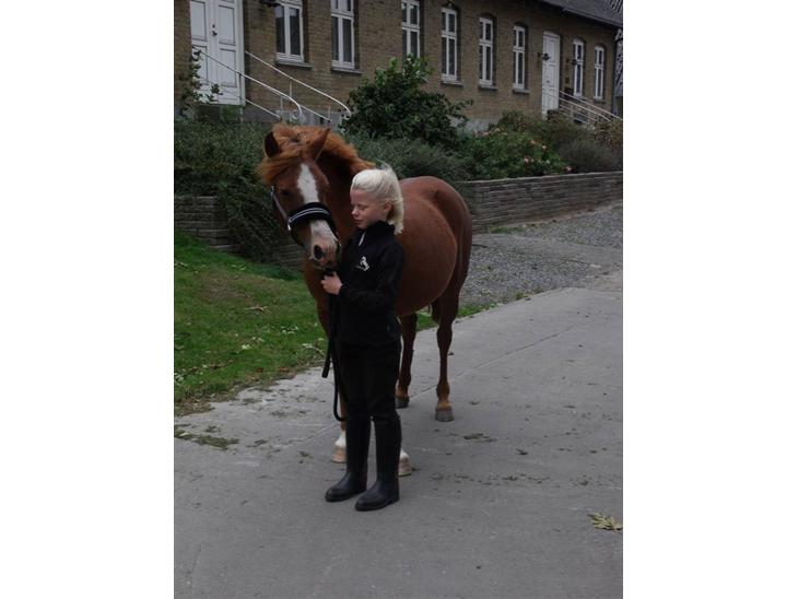 Flot rød hoppe, med en bred blis, og sokker på forbenene. Hun er ikke så kraftig, men passer fint til Johanne på 8 år. I øjeblikket har hun lidt kort hale, da hun har haft føl i sommer, og det har spist halen. Hun virker meget nem at arbjede med, og Min datter er glad for hende, og glæder sig til at hygge sig med hende. Men hun er hoppe.