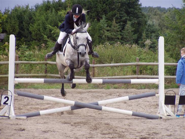 han springer 90-100 cm, til stævner, som hest det vil svare til LB og LA som pony. Her hjemme når vi træner springer han lidt højere. Det højeste han har sprunget med rytter er 125cm