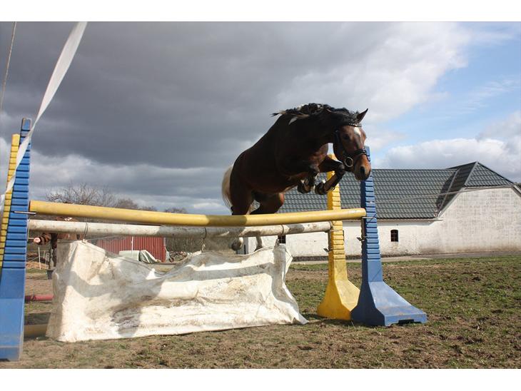 I påsken løssprang jeg stjernen for første gang og som sagt var hun en rigtig stjerne. Fandt da lige ud af at den lille også kunne springe. Hun ente med en okser med plastik mur på 125cm, ville ikke sætte det højere op da hun kun er 3 år og det er første gang. Hun brugte ryggen rigtig godt som kan ses på det første billed og kommer også godt over, engang imellem var der lidt fejl hvor hun kom for tæt og var nødt til at smide sig lidt mere over springet, men over skulle hun mente hun selv (: Dejlig lille pony kan næsten ikke vente med at må springe på hende selv.!