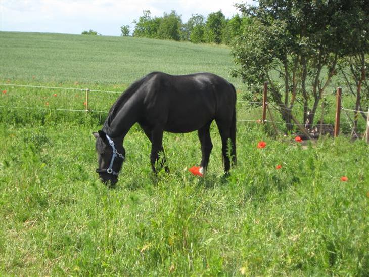 Smuk sort hoppe med lav sok hb. slank muskeløs bygning, godt temp. og nervefast, en glad hoppe der bliver en god ridehest.