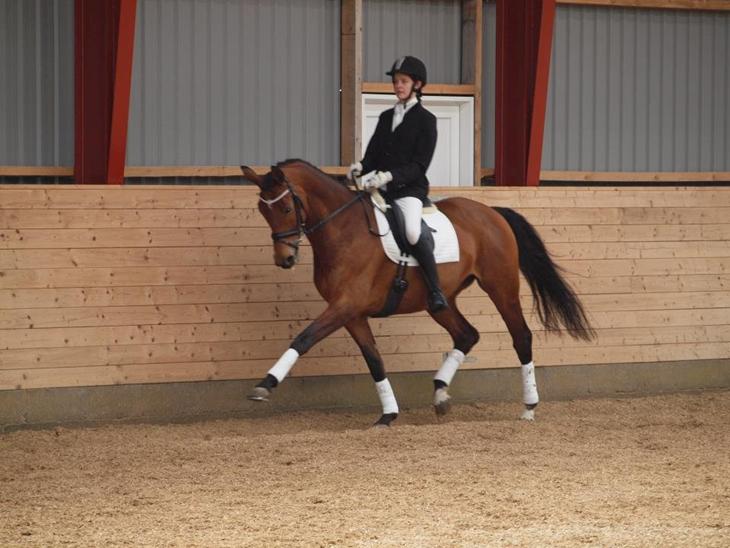 vi har kendt hende i lang tid da hun kom der hen hvor vi stod med vores heste engang var hun dømt ikke ridelig af sampltlige dyrlæger først skulle hun kåres men det lykkedes hende at ligge fast i boksen et par uger inden og endte op på ansager hvor hun stod en dag hun nåede ikke at blive redet så meget at hun var klar til rideprøven til kåring derefter skulle hun gå egnthedstest for at få sit R MEN hun begynte efter at man havde redet hende i 5 dage gik hun som en pony dyrlægerne som var ude at kigge på hende kunne ikke fidne noget på hende og røngen kunne ikke finde noget på hende så hun blev dømt til aldrig at blive ridehest. så ejeren af hende valgte at sætte hende tilsang for sølle 15000 så endete hun op der hvor vi stod hvor den nye ejer valgte at give hende en chanche for at blive ridehest igen så hun tilkaldte en dyrlæge der ikke kendte hendes baggrund han kom og mærkede på hedne og trykkede hedne en gang i lænden hvor hun sparker ham så trykker han engang til og hun synker sammen i bagbenene så siger han at nu kan du begynde at arbejde med hende. men den her hest er bare ikke særlig heldig for en dag hun kom ind fra fold havde hun et kæmpe sår på den ene has og der var ingen muglighed for at sy det sammen så det skulle bare hele af sig selv ejeren havde ikke særlig meget tid til hende så mig og min mor hjalp med at holde såret rent det var der vi begyndte at have noget med hende at gøre og da det tog meget lang tid om at hele valgte ejeren at sætte hende i fol, såret er nu helet rigtigt fint men man kan stadig se at der har været noget på det da hun er en hel del hevet i den ene has. hun bliver ikke redet særlig meget vi har været oppe på hende et par gange som hun har taget rigtig fint hun har tre rigtig gode gangarter hun er dog ikke særlig stærk i galoppen men det skal nok komme, hun står dog helt stille lige pt da hun er i fol og vi vil helst ikke belaste hende mere.