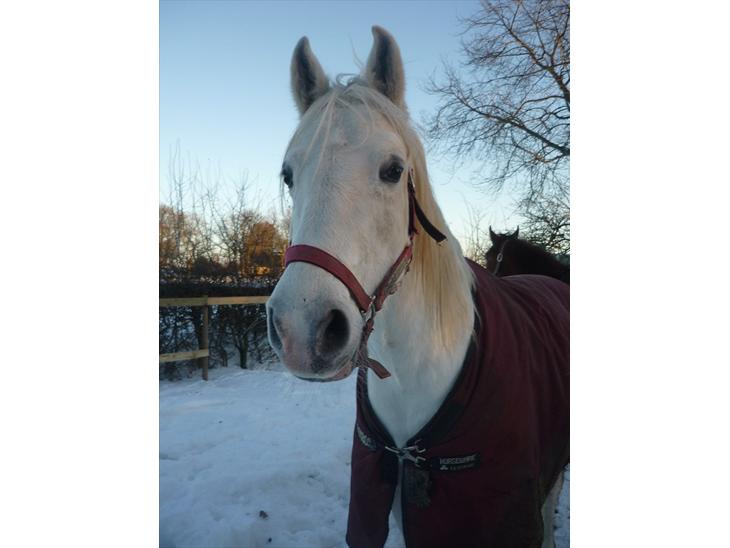 Lys grå/hvidskimmel med blis - ikke synlig nu da hun er næsten hvid.