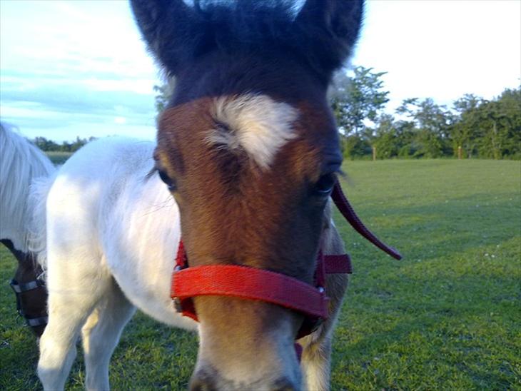 Han er en lille shetlænder hingst eller deromkring...han er broget på den ene side men mest hvid på den anden side. Han har det mest nuttede lille brune hovede med en hvid blis. 4 hvide hove og en kridhvid hale med en sort dusk forneden. Han har de skønneste øjne og er nøgagtig lige så sød, venlig fræk og dristig som han ser ud...
