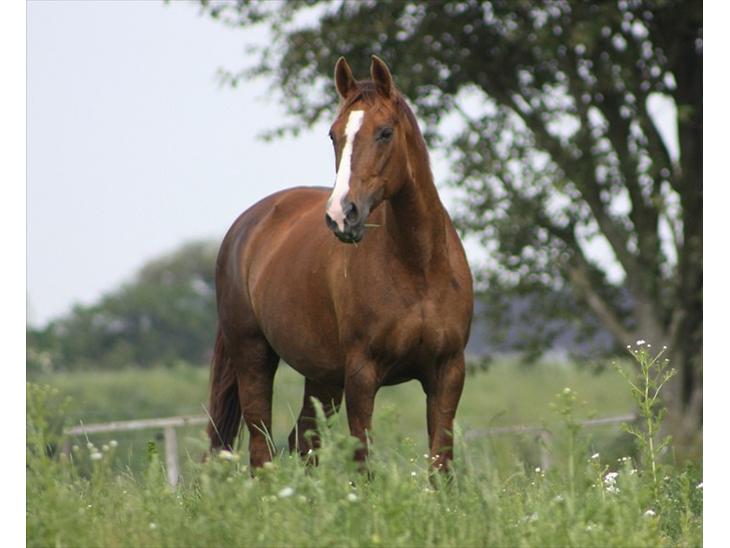 fuksrød hoppe med en blis og en sok.. Synes selv hun er smuk dame ;o)