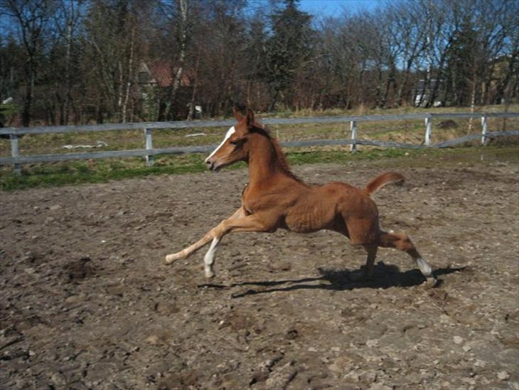 Første gang, jeg trak med ham var den sidste dag i sommerferien 2010, hvor alle hestene skulle flyttes fra én del af engen til den anden. Han var så fin og fandt sig 100 % i at få sat tov på og blive trukket afsted lige så stille. Han blev bange for hegnet, da vi skulle igennem det og væltede sig selv omkuld. Søde føller, hæhæ - selvom det selvfølgelig var lidt synd.. Efter 3 gange at forsøge at løbe fra mig for at komme op til sin mor, som gik omkring 10-15 meter længere fremme - nej, der var ikke nogen, der gad vente på os - faldt han til ro og traskede afsted lige så stille sammen med mig.