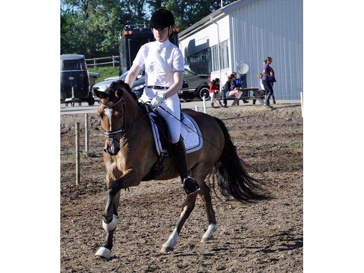 Men vi besluttede at købe ham, og vi fik ham hjem i Maj 2010. Der kunne han gå rundt på volte i skridt, trav og galop. Men han er utrolig lærenem, så han kan alle ponyøvelser nu.