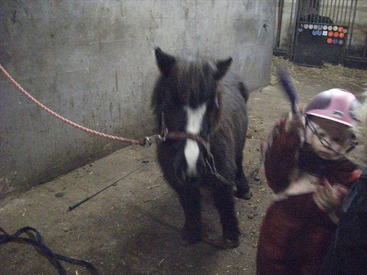 Jeg kender hende ikke så godt i nu da jeg kun har haft hende i 2 uger.. Har lige fået hende hjem og hun har kun haft med mennsker at gøre i 1 år ellers har hun bare gået på en mark med hendes søster og de kaldet for pony og pony. Så de første 4 år af hendes liv har hun ikke haft mennske kontakt... Så tidliger ejer har arbejder meget med hende for at man kunne komme til hende. Jeg skal nu så prøve om jeg kan ride hende til så min datter kan ride hende. Det kommer til at tage lang tid med hende. Hun bliver mere og mere glad for mig og jeg kan kommer mere til hende.. Kan komme til hende hals og forben og maven...Men hendes bagben kan jeg ikke i nu men hun er ikke så slem mere.. Min datter trak hende selv over i stalden og det sage hun ikke noget til... På billederne er det færste gang hun står bundet og sage hun ikke noget til.. min datter striglede hende også for færste gang.. Tog hun rigtig pæn...