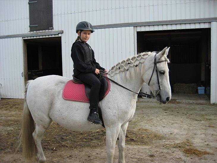 Hvid med lidt prikker i starten var hun helt hvid. Jeg ridder på heste. Hun er rigtig sød i skoven. Hun eeeeeeeeeeeelsker at blive nusset. Vi ridder stævner og øver os til stævner. Jeg ridder i skoven, i ridehus, hygger og går ture. Hun er mega god at ride på hun er en super dejlig pony <3
