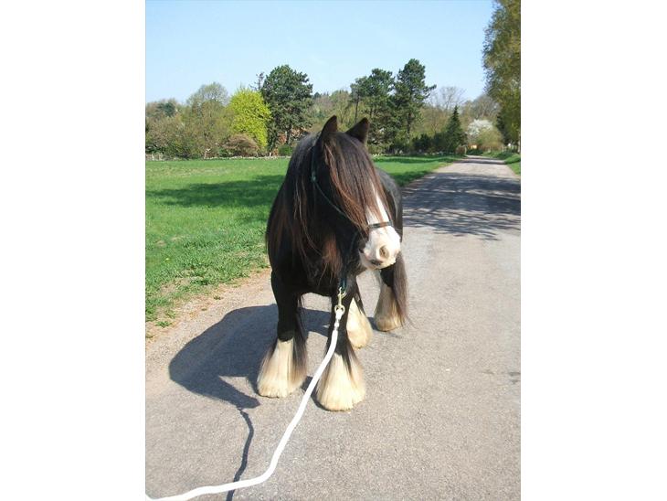 gregon er en sort tinker med 4 hvide sokker, en hvid blis og så har han en hvid plet under maven :) han har godt med hovskæk og med kraftig hale :) - han er bare en lille ritter sport, kvadratisk, praktisk, god :)