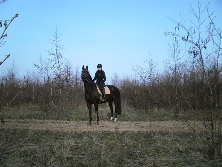 I dressuren er hun god og nem! Jeg købte hende egentligt for at springe på hende, hvilket hun synes er super sjovt! Men jeg har lagt en masse arbejde i dressuren i stedet for, så jeg lige kunne lære hende at kende, og styrer hende ordentligt mellem springende. Men efterhånden som jeg har redet mere og mere dressur, er jeg også blevet mere og mere glad for at ride det på hende - Så det er det jeg bruger mest tid på lige PT. :-) Jeg springer selvfølgelig også - og hun er super fin og glad for det. Det er dejligt med noget varieret ridning! - også med en tur i skoven!