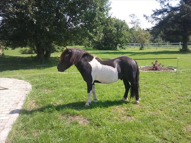 Han er sortbroget. Han er et nusse hoved, men fræk, han vil meget gerne styre hele folden. Han går sammen med en anden shetlænder hingst, og en oldenborg type vallak, så han har travlt når han vil styre det hele, men de slås ikke, de leger.