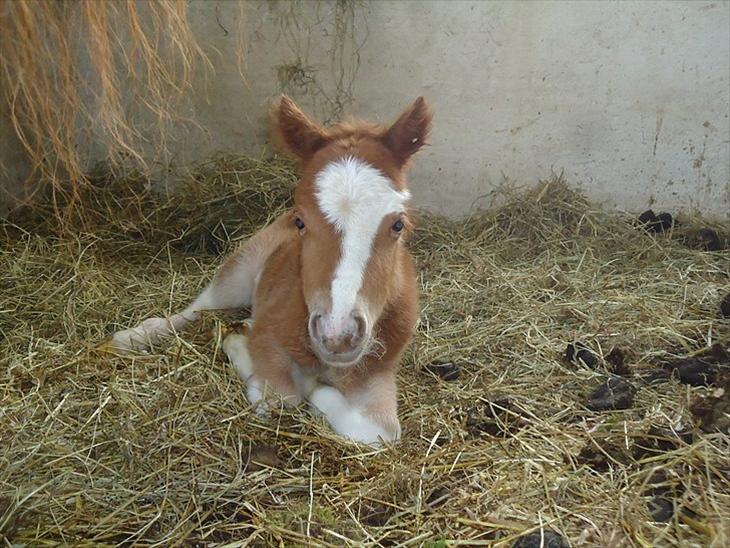 Only blev født i går aftes (d. 10-05-11) kl. 22.52. Alarmen gik, og jeg tænkte at det bare var endnu en falsk alarm. Min mand mente dog at jeg skulle gå opi og tjekke vores overvågningskamera alligevel. Da jeg fik tændt for fjernsynet kunne jeg se at Caddy allerede havde folet, så jeg sprang ud i stalden og fandt lille Only, stadig liggende i hinden. Jeg fik åbnet op og heldigvis trak han vejret uden problem!