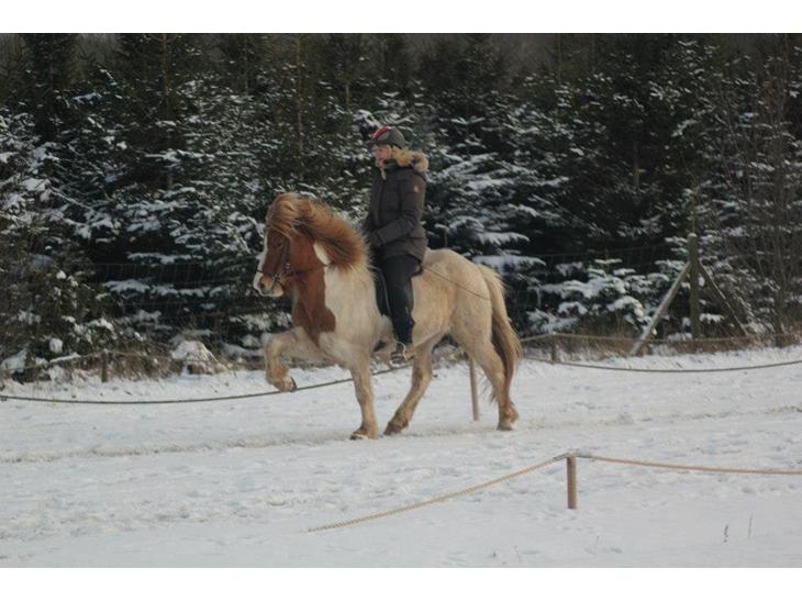 Tölten er flot med stor løft og god bagbensaktion, hun træder flot ind under sig .