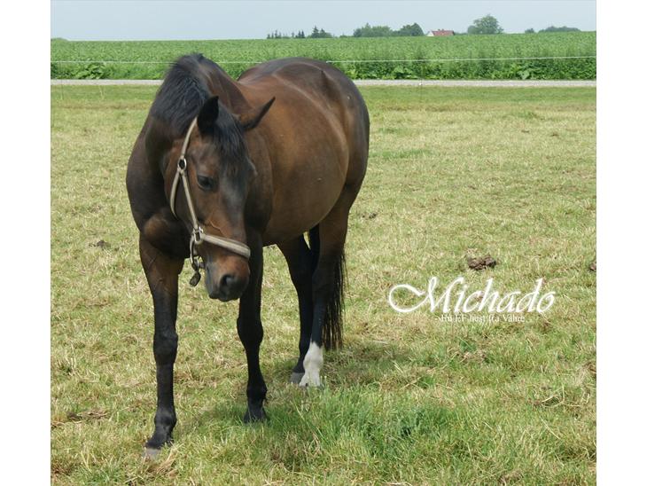 Michado er en fantastisk dejlig hest, som både er god på dressurbanen, springbanen og i skoven. Når hun skal springe, bliver hun dog lidt svær at stoppe efter hvert spring, men det skal der bare arbejdes med :) Hun springer over alle lave forhindringer som man gerne vil have hende over, men når højderne bliver sat op, siger hun fra. Den eneste gang jeg er faldet af hende, var fordi hun ikke ville springe over et spring på omkring 70-75cm.