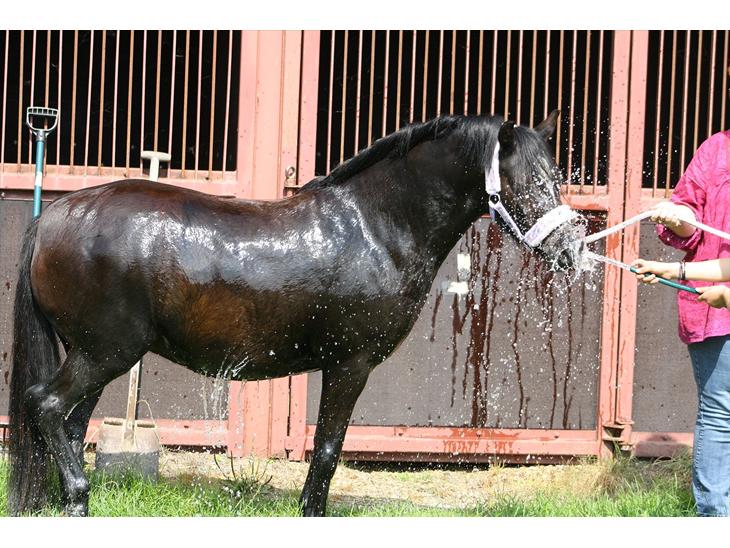 sikken en smuk kulsort pony,hun ser ud til at elske vand