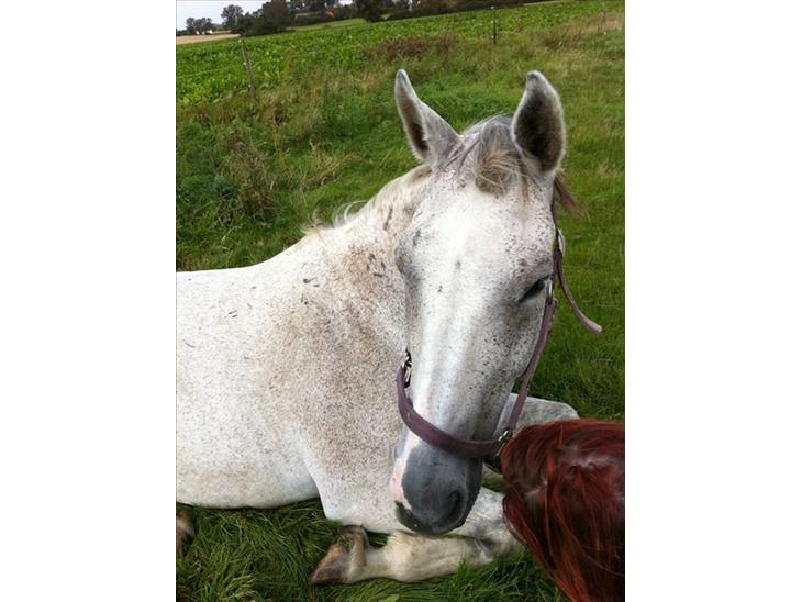 . Han er lige rykket til et sportsridecenter , så vi kan ride indendørs og komme lidt igang . Han er en dejlig kraftig hest , han har i sin yngre dage været rigtig fin hvid med store grå pletter.
