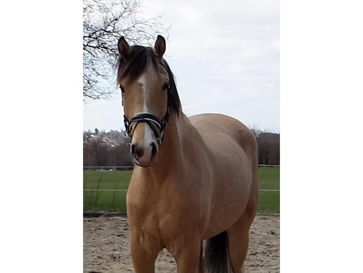 Han har en utrolig smuk guld glinsende farve med flerfarvet man og hale. Farven er Dunskin? Meget usædvanlig farve.