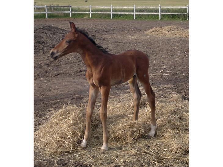 En dejlig ædel hingst som er født d. 1/7-2012. Brun med 4 hvide sokker. Folingen gik fint og han var hurtigt på benene. Desværre fik han en slem forstoppelse som gjorde at han blev indlagt på landbrughøjskolen kun 19 timer gammel og måtte igennem en operation :-( så han er stadig indlagt nu her 10 dage gammel.....men vi håber at få vores dejlige lille fyr hjem inden længe.