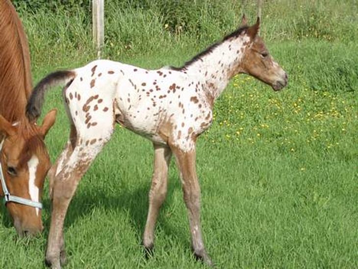 En Lille brun plettet hoppe men brunt hoved (og hvid meleret nogle steder) samt grå/sorte/brune ben med enkelte hvide pletter.. Hun er bare så dejlig!!